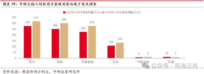 中国大陆人均医用手套仅9只/人,人均使用量远低于全球平均水平。未来随着人民生活水平的提高以及新的健康威胁出现,人们的安全及卫生意识显著提高,以及不断扩大的卫生技术人员数量形成了庞大的医用手套用户群体,对一次性手套的需求随之增加,整体市场未来增长潜力十足。根据沙利文报告,2020年中国大陆人均医用手套仅9只/人,相比美国人均医用手套为300只/人,我们国家和海外发达国家在手套使用习惯上,仍有较大的差距。