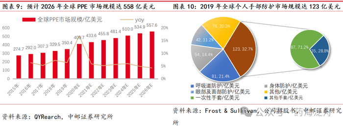 2019年全球手部防护产品市场规模为123亿美元,其中一次性手套占手部防护产品市场71.2%。根据QYRearch报告,2019年全球个人防护装备市场估值为350.4亿美元。在预测期内,严格的职业健康和安全法规将推动全球个人防护设备市场的增长。根据弗若斯特沙利文报告,2019年全球个人防护装备市场达到376亿美元。其中手部防护产品为最大的子类别,2019年手部防护产品市场份额为32.7%,且一次性手套占手部防护产品市场71.2%。
