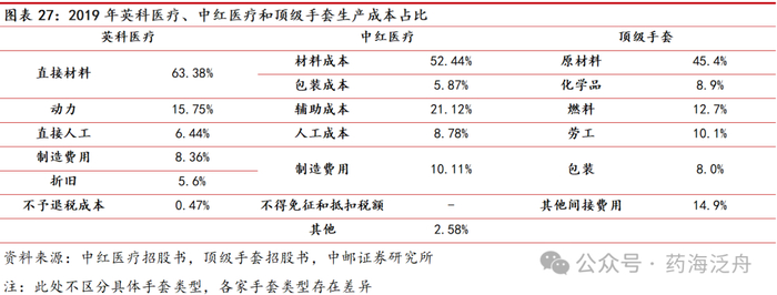 在生产成本占比方面,手套原材料占比手套成本一半以上。手套的原材料主要包括原材料成本(主要为天然橡胶乳胶及丁腈乳胶的成本)、化学品、燃料(天然气、煤)、包装材料(如内盒及纸箱)及劳工成本(即指参与制造及生产的雇员工资及薪金开支),其中原材料(主要为天然橡胶乳胶及丁腈乳胶的成本)是手套的主要成本。根据中红医疗招股书和顶级手套招股书等数据资料,2019年英科医疗直接材料占比63.38%,中红医疗材料成本+包装成本合计占比58.31%,顶级手套原材料+化学品占比54.3%。