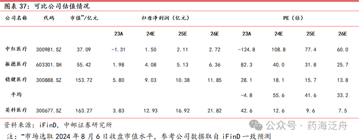 与公司手套业务相似性高的同行业公司有中红医疗,同时结合低值耗材属性,以及同为后疫情阶段去库存的振德医疗和稳健医疗进行对比。