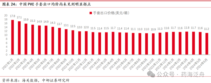 中国PVC手套出口均价尚未见到明显拐点。根据海关数据按每箱1000只手套计算,对应每箱PVC手套2024年6月出口均价为11.15美元/箱,环比价格下跌4%,其中每箱PVC手套出口均价最低点为2023年10月。因此我们认为国内PVC手套目前还处于买方市场阶段,出口价格暂时还未看到明显的上升趋势。