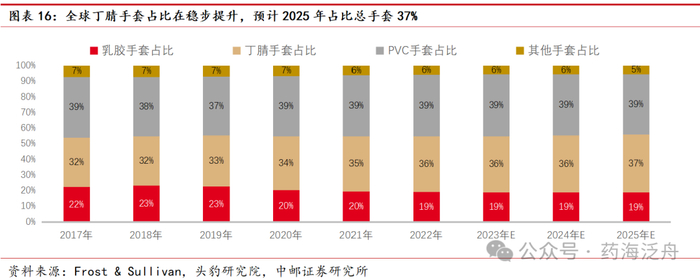 未来丁腈手套有望超越PVC手套,成为全球占比最多的手套种类。根据弗若斯特沙利文数据,2017年乳胶手套、丁腈手套、PVC手套占比分别为22%、32%和39%,预计到2025年乳胶手套、丁腈手套、PVC手套占比分别为19%、37%和39%。我们认为丁腈手套性能优于PVC手套,而丁腈手套的原材料稳定性高于乳胶手套,未来丁腈手套有望超越PVC手套成为全球占比最多的手套种类。