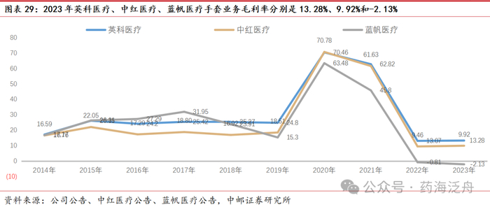 2023年英科医疗公司手套业务毛利率高于中红医疗和蓝帆医疗。根据英科医疗、中红医疗、蓝帆医疗公告,我们对比了三家手套生产企业从2014年—2023年的手套业务毛利率,其中英科医疗毛利率一直处于较高水平。2023年英科医疗、中红医疗、蓝帆医疗手套业务毛利率分别是13.28%、9.92%和-2.13%,英科医疗公司毛利率为三家最高。