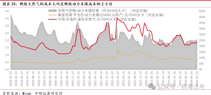 目前燃烧天然气成本大约是燃烧动力末煤成本的2.5倍。以2024年7月30日的价格计算,秦皇岛港动力末煤(Q5500,山西产)价格为913元/吨,按1千克标准煤对应7000大卡,对应单位热量价格为0.72元/5500大卡;国内液化天然气价格为4404.80元/吨,按1公斤液化天然气对应13000大卡,对应单位热量价格为1.86元/5500大卡,可见目前燃烧天然气的成本,大约是燃烧动力末煤成本的2.5倍。