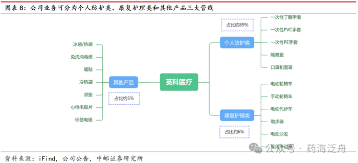 公司业务可分为个人防护类、康复护理类和其他产品三大管线。其中个人防护类主要包括一次性丁腈手套、一次性PVC手套、一次性PE手套、隔离服、口罩和面罩产品,康复护理类主要包括电动轮椅车、手动轮椅车、电动代步车、助步器、电动沙发和医用床边桌等产品,其他产品主要包括冰袋/热袋、免洗消毒液、暖贴、冷热袋、凉垫、心电电极片和标签电极等产品。