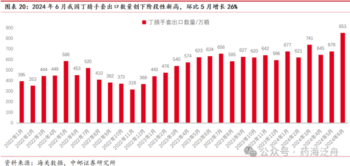国内手套出口中丁腈手套占比持续提升。根据海关数据显示,2024年6月国内丁腈手套出口数量与PVC手套出口数量基本持平,丁腈手套出口占比逐渐上升,出口数量创下2年新高。