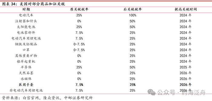 医用橡胶手套的关税将从7.5%提高到25%,加征时间设在2026年。在医疗耗材方面,注射器和针头(syringes and needles)关税将在2024年从0%提高到50%;口罩、部分呼吸器在内的个人防护品(certain personal protective equipment)关税将在2024年从0%-7.5%提高到25%;医用橡胶手套(rubber medical and surgical gloves)的关税将从7.5%提高到25%,加征时间设在2026年。
