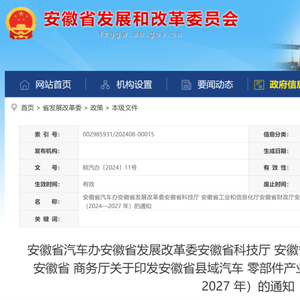 安徽省汽车办 安徽省发展改革委 安徽省科技厅 安徽省工业和信息化厅 安徽省财政厅 安徽省商务厅关于印发安徽省县域汽车零部件产业集群建设行动方案 (2024—2027 年)的通知