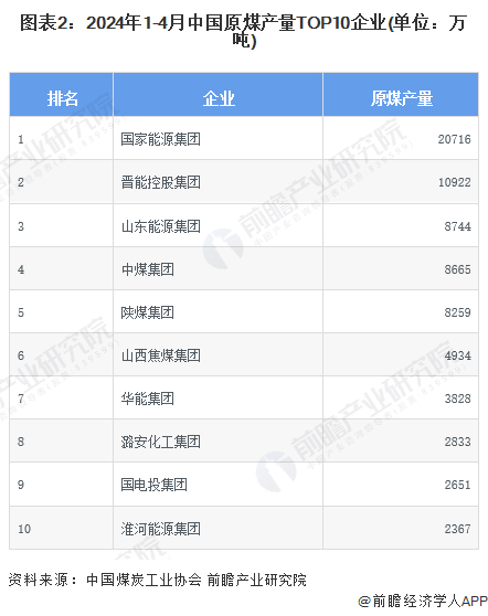 2024年1-4月,全国规模以上企业生产原煤共14.8亿吨,其中排名前十的企业产量合计达7.4亿吨,占比接近50%。具体到企业来看,国家能源集团位列第一,原煤产量共20716万吨;晋能控股集团紧随其后,原煤产量共10922万吨;其余企业的产量均在10000万吨以下。