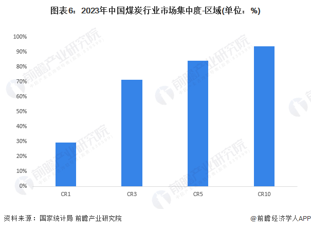 根据各省份市场份额计算,2023年,煤炭行业区域市场集中度CR1为29.12%,CR3为71.46%,CR5为84.08%,CR10为93.53%,可见行业的区域竞争高度集中。