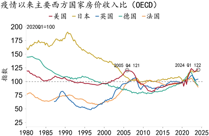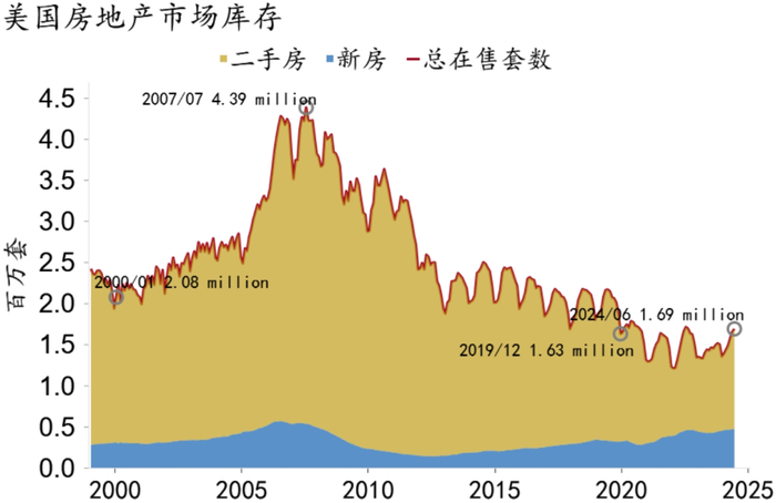 资料来源:Macrobond,招商银行研究院然而,对单一概念的高度依赖本身就构成了风险。无论是竞争格局恶化带来的利润缩水,还是人工智能发展预期未能兑现,均可能导致美股牛市的终结。再看美国楼市。2023年以来,美国住房成交量在高利率的压制下低位徘徊,但价格水平却在供给短缺的驱动下高位上涨,累计涨幅已达7.6%。从估值看,美国房价收入比不但已经高于其他所有主要西方国家,而且超越了次贷危机前夕的峰值水平(图5)。从库存看,美国成屋库存升至169万,去化周期升至4.1个月,全面回归疫前(2019年)水平,指向新冠疫情后的“住房荒”已有所缓解。值得注意的是,美国楼市的新房库存已经逼近次贷危机前夕的历史峰值水平,二手房库存低企很大程度上来自于快速加息对置换交易的压制,这意味着住房市场可能存在较大潜在供给(图6)。