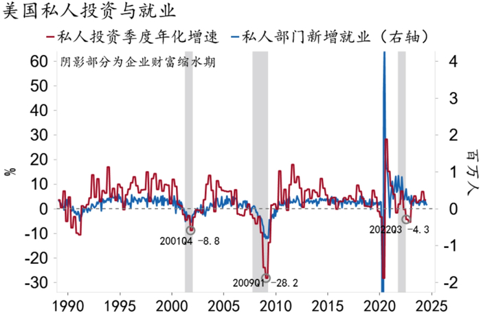 资料来源:Macrobond,招商银行研究院企业部门方面,我们用与居民部门相同的方法定义企业财富【注释2】的“缩水期”,也得到了与居民部门近乎完全相同的三个时期(图9)。企业部门经济行为在这三个时期均表现出非线性收缩,投资增速均大幅转负(图10)。有趣的是,1998-2002年美国企业部门资产与利润走势发生背离,前者先涨后跌,后者先跌后涨(图9)。企业部门投资与雇佣行为前期保持平稳而后期急剧收缩,与资产走势一致(图10)。这指向相较于利润波动,企业行为对财富效应的变化更为敏感。一方面,资产价格的波动远大于利润。另一方面,企业可更为灵敏地捕捉到资产价格波动背后的信息,并通过雇佣行为影响至居民部门,进而放大了资产价格波动对实体经济的冲击。