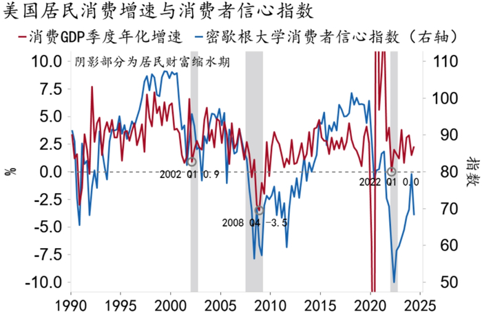传导机制:资产负债表的“呼吸”资产价格的起落,直接影响着微观主体的经济行为。涓滴成河,各部门资产负债表的“呼吸”,最终将决定宏观经济的起落。居民部门方面,我们将居民资产连续两个季度及以上收缩的时期定义为居民财富的“缩水期”。有数据记载(1989Q3)以来,居民财富的“缩水期”仅出现过三次,分别是互联网泡沫时期(2002Q1-2002Q3)、次贷危机时期(2007Q3-2009Q1)和本轮美联储加息初期(2022Q1-2022Q3,图7)。居民消费在以上三个时间均表现为非线性走弱,充分说明资产价格下跌带来的财富缩水会使得居民经济行为迅速趋于保守(图8)。