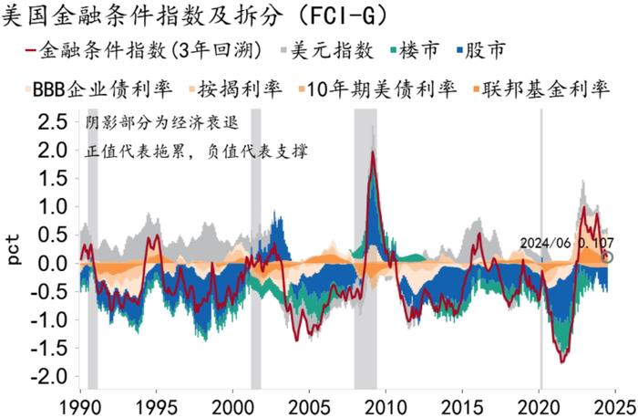 3、金融条件指数(FCI-G)是美联储发布的金融条件测度指标,反应了金融情况对经济形势的影响,正值代表拖累,数值越大则拖累越大,负值代表支撑,数值越小则支撑越强。
