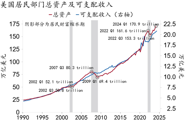 资料来源:Macrobond,招商银行研究院去年以来,市场对美国经济衰退的预期持续落空,正是资产价格主导经济走势的体现。“股楼双牛”令美国经济摆脱了高利率“引力”的束缚,实现逆势扩张(图11-12)。从财富水平看,2023Q1-2024Q1美国居民部门资产规模增长11%,企业部门金融资产增长9%,有效支撑了美国的金融条件【注释3】(图12)。