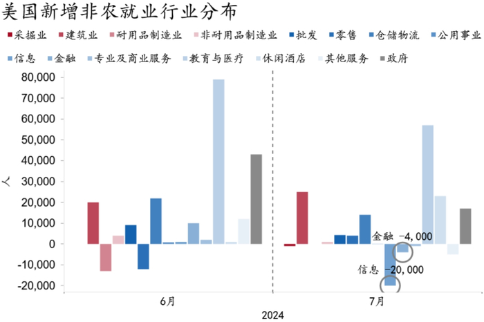 金融脆弱性:警惕“蝴蝶效应”7月美国就业市场非线性转冷,很可能已经受到了美股见顶回落的影响。一个证据是,对当前股市高度敏感的信息技术和金融就业全面转向收缩,前者就业人数下降了20,000,后者就业人数下降了4,000(图13)。与此同时,超预期走弱的就业数据驱动了“衰退交易”,美股自8月2日起进入加速下跌阶段,并于8月5日触发“黑色星期一”,亚太与欧美股市发生共振恐慌式下跌。