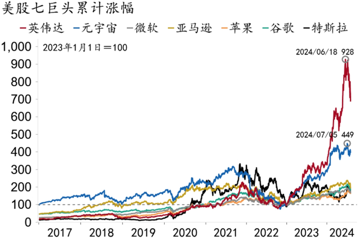 资料来源:Macrobond,招商银行研究院站在当前时点评估,本轮牛市已经进入风险积蓄期,股市与楼市的估值水平正逐步脱离合理区间,成为 “黑色星期一”的关键诱发因素。如若资产价格进一步上涨,可能带来回调风险的持续积累,并推动市场逐步逼近牛熊转换。先看美国股市。2023年以来,纳斯达克指数上涨逾七成,标普500指数上涨逾五成,道琼斯指数上涨逾两成,三大指数全面超越加息前高位,大超市场预期,筑成了美国经济对抗史上最快加息周期的坚实防线(图1)。从结构看,本轮美股牛市涨幅分布极为不均,多数股票在高利率压制下表现平淡,高涨幅集中在科技股巨头,其中九倍股英伟达(NVIDIA)和四倍股元宇宙(META)表现尤为亮眼,反映出本轮牛市对人工智能概念的高度依赖(图4)。