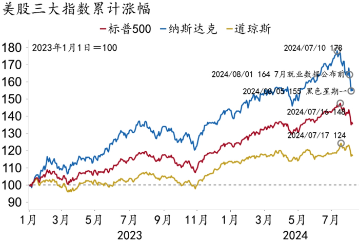 引言:海外股市经历“黑色星期一”8月5日,亚太及欧美股市遭遇“黑色星期一”。美股三大指数全面收跌,标普500指数下跌3.0%,纳斯达克指数下跌3.4%,道琼斯指数下跌2.6%。本轮下跌的直接诱因之一,是8月2日美国非农就业数据大幅不及预期导致的“衰退交易”(图1)。市场担忧美国经济陷入衰退,叠加前期美股涨幅已经非常可观,投资者纷纷选择抛售风险资产兑现盈利。