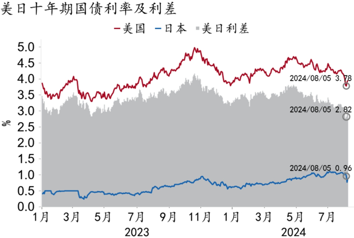 资料来源:Macrobond,招商银行研究院此外,“衰退交易”导致美国利率水平快速回落,叠加日央行步入加息周期,美日利差大幅收窄(图2),日元升值预期进一步发酵,此前长期持续的“套息交易”【注释1】陡然逆转,导致全球市场风险偏好非线性回落。由于套息交易者多为日元区玩家,全球资金流向逆转对日本股市冲击最大。日经225指数在“黑色星期一”领跌全球,跌幅达到了惊人的12.4%。