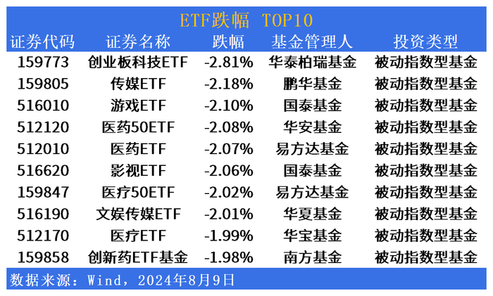 2024年8月9日,Wind数据显示,三大指数冲高回落。房地产、消费电子板块领涨;教育、医疗服务、文化传媒持续下跌。成交额再度回落。