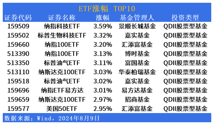 具体来看,纳指科技ETF(159509)领涨达3.59%,标普生物科技ETF(159502)、纳指100ETF(159660)、纳指100ETF(513390)、标普油气ETF(513350)、纳斯达克100ETF(513110)、标普油气ETF(159518)、纳指ETF易方达(159696)跟涨超3%,纳斯达克100ETF(159659)、美国50ETF(159577)涨超2%。