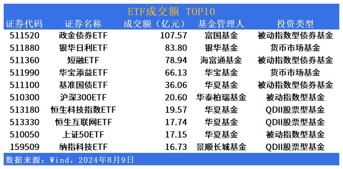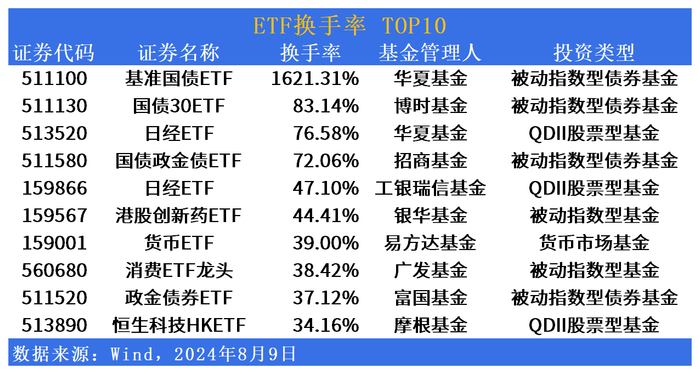 换手率方面,基准国债ETF(511100)换手率居首,超1600%。
