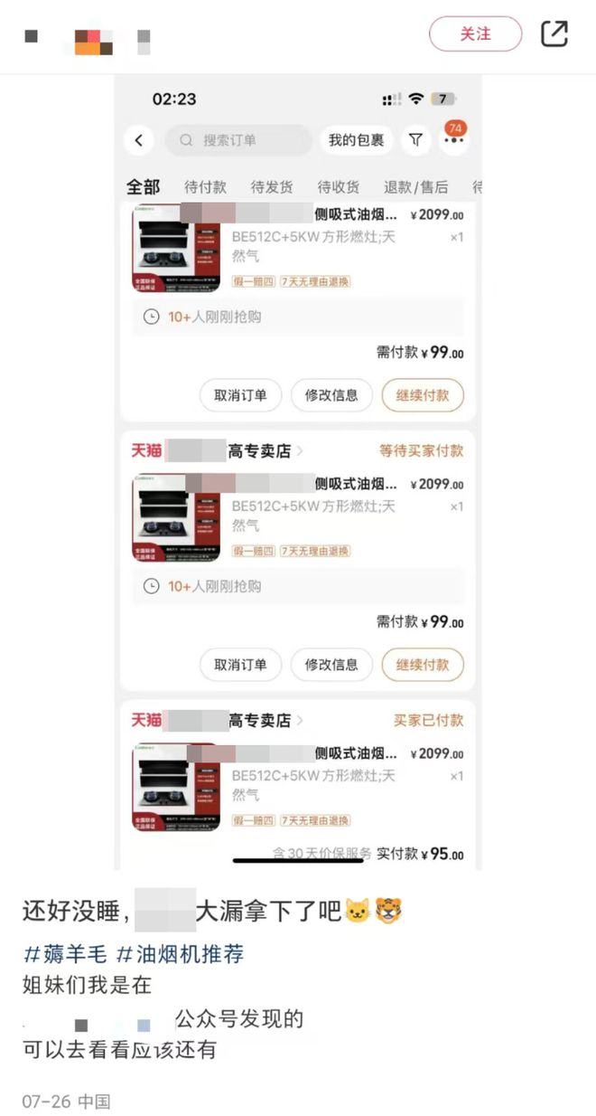 “有人发现这个‘羊毛’后,就到各大社交平台和微信群散播消息,一窝蜂的人过来下单。”梁先生表示,很多人在网上发帖炫耀自己花几块钱买到了消毒柜,一百来块买到了抽油烟机。“粗略统计了下成交金额约1200万,但是实际货物价值约两个亿。”梁先生无奈坦言,自己的店铺根本无法承担这样的巨额损失,也无法给买家发货。