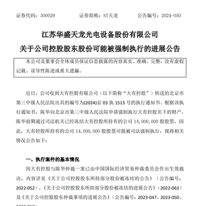 8月6日晚间,ST天龙(300029.SZ)发布公告,公司控股股东大有控股有限公司(以下简称“大有控股”)所持公司1400万股股票可能被司法强制执行,占公司总股本的6.98%。如本次司法处置最终成交,大有控股将持有公司1159.85万股股份,占公司总股本的5.78%,公司控股股东将发生变更。