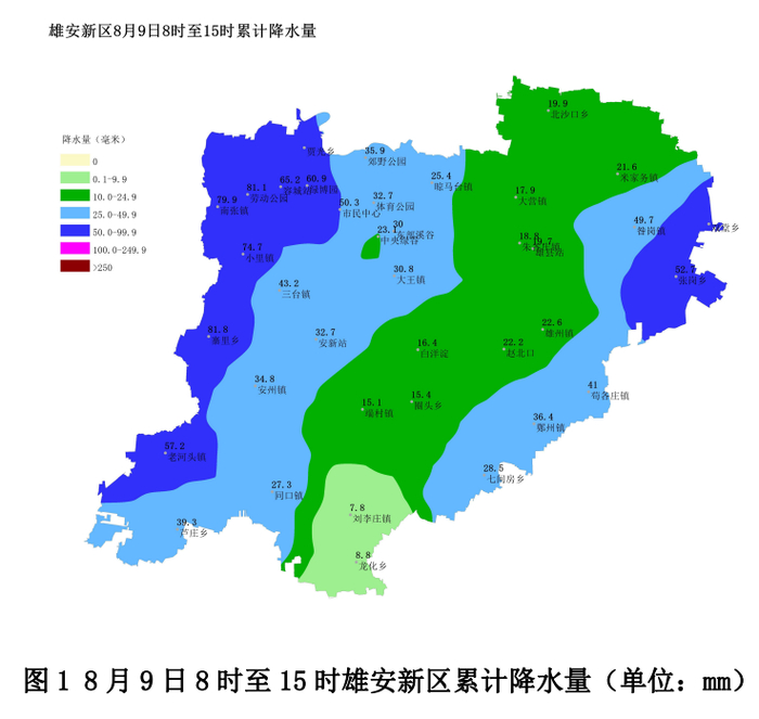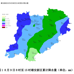 天气实况:8月9日8时至15时雄安新区降中雨到大雨,局部暴雨,伴有雷电。降雨区平均降雨量为33.5毫米, 暴雨13站、大雨37站、中雨28站、小雨5站,最大降雨量出现在安新县寨里乡和容城县劳动公园为80.4毫米,最大小时雨强出现在容城县劳动公园56.4毫米。