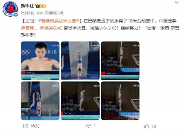 跳水男子10米台预赛,曹缘杨昊晋级半决赛 环球网 环球网官方账号 2024.08.0918:22 关注 在巴黎奥运会跳水男子10米台预赛中,中国选手曹缘杨昊晋级半决赛。祝福小伙子们!继续努力!(记者:张薇 李嘉 乔本孝)
