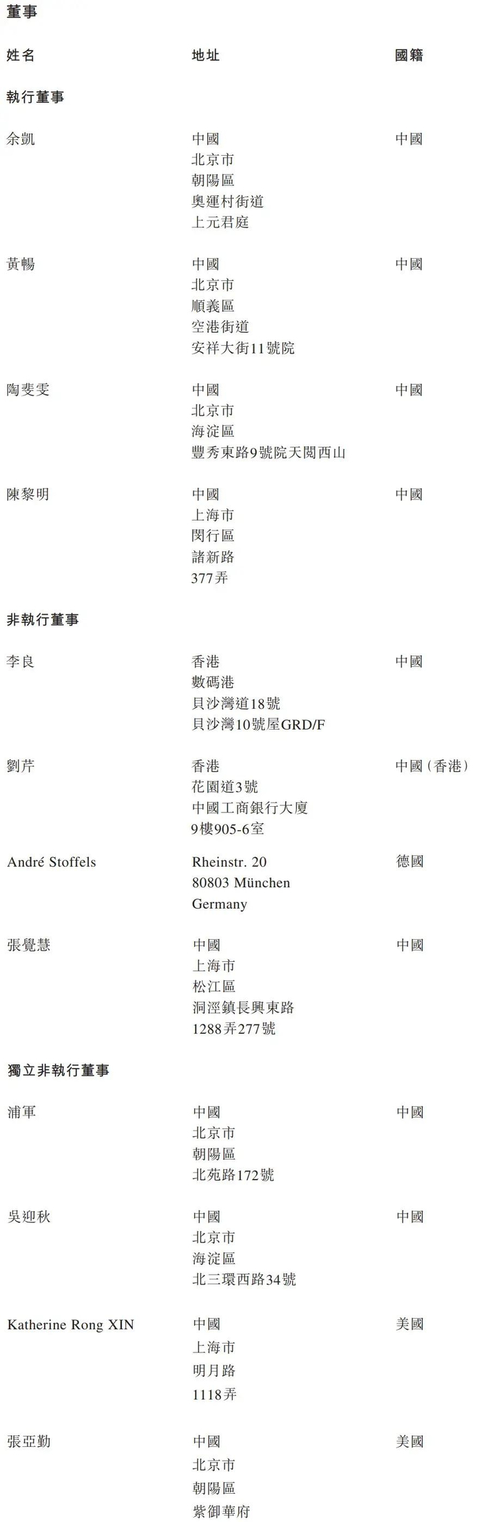 地平线执行董事分别为余凯、黄畅、陶斐雯、陈黎明;非执行董事分别为李良、刘芹、André Stoffels、张觉慧;独立非执行董事分别为浦军、吴迎秋、Katherine Rong XIN、张亚勤。