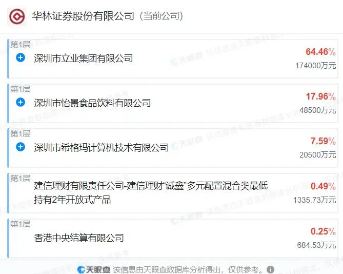 2013年,对部分股权清理之后,华林证券形成“三足鼎立”的局面——立业集团、怡景食品、希格玛分别持有华林证券71.62%、19.95%、8.43%的股份。