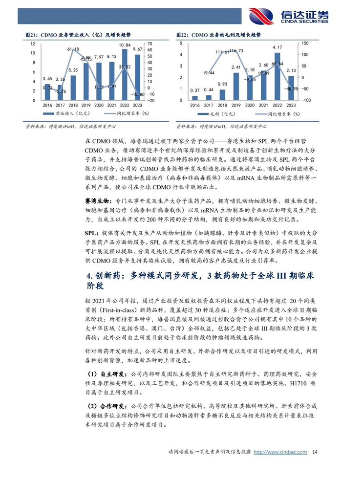 大分子CDMO业务:公司两家全资子公司赛湾生物及SPL两个平台,开发及制造包括天然来源产品、哺乳动物细胞培养、微生物发酵、细胞和基因治疗以及mRNA生物制品所需原料等系列产品。2023年因盈利水平较高的为mRNA疫苗提供所需关键酶的服务合同完结,而新服务合同需要更长时间才能在开发的各个里程碑阶段实现收入确认,使得2023年CDMO业务增长承压;2023年第四季度开始回暖,我们预计2024-2026年公司CDMO业务有望实现复合超10%的较快增长。