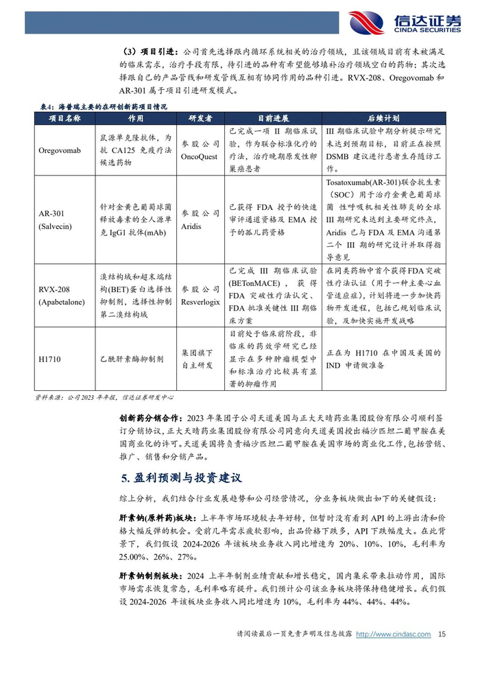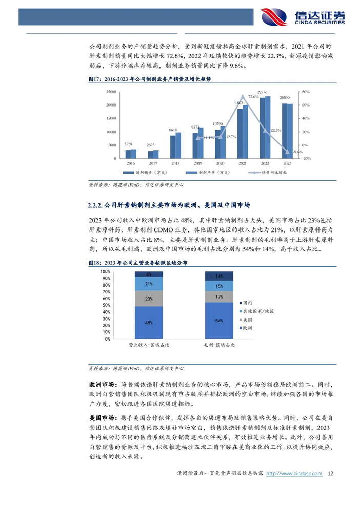 肝素制剂业务欧美市场表现靓丽,国内集采助力上量:2023年公司肝素制剂业务收入29.79亿,毛利率提升8.25个百分点至43.58%,这得益于肝素钠全产业链布局及供应链管理的比较优势,有效管控成本。2024年公司在欧洲及美国等海外市场持续发力,国内市场2023年集采降价带动销量大幅提升,集采模式下销售费用降低,有望带动量的增长。我们预计2024-2026年公司制剂业务有望实现复合10%的稳健增长。