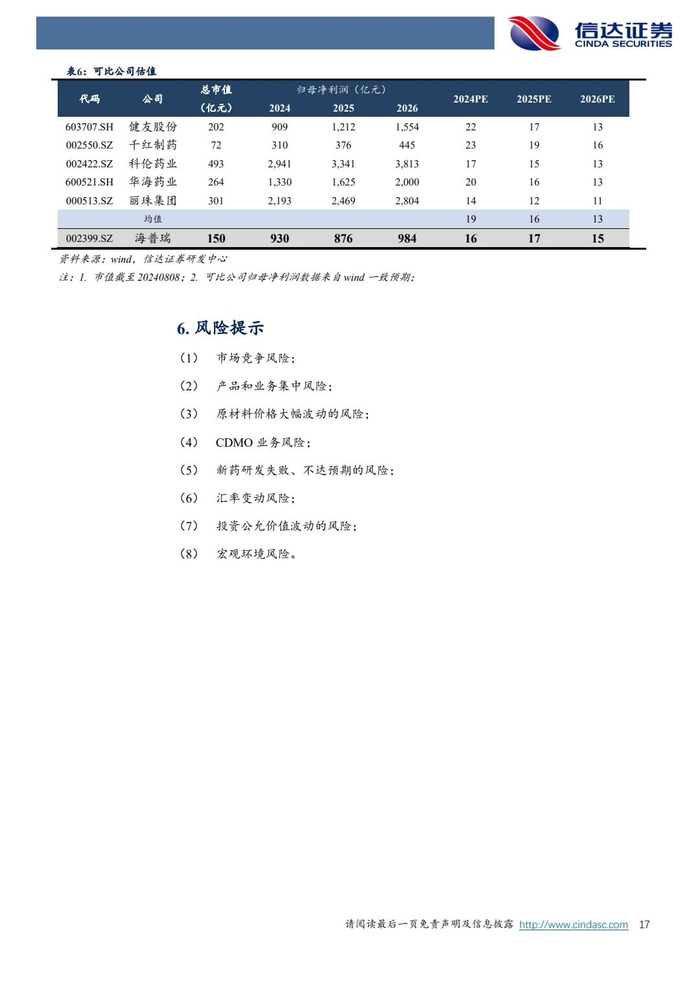 风险因素:市场竞争风险;产品和业务集中风险;原材料价格大幅波动的风险;CDMO业务风险;新药研发失败、不达预期的风险;汇率变动风险;投资公允价值波动的风险;宏观环境风险。