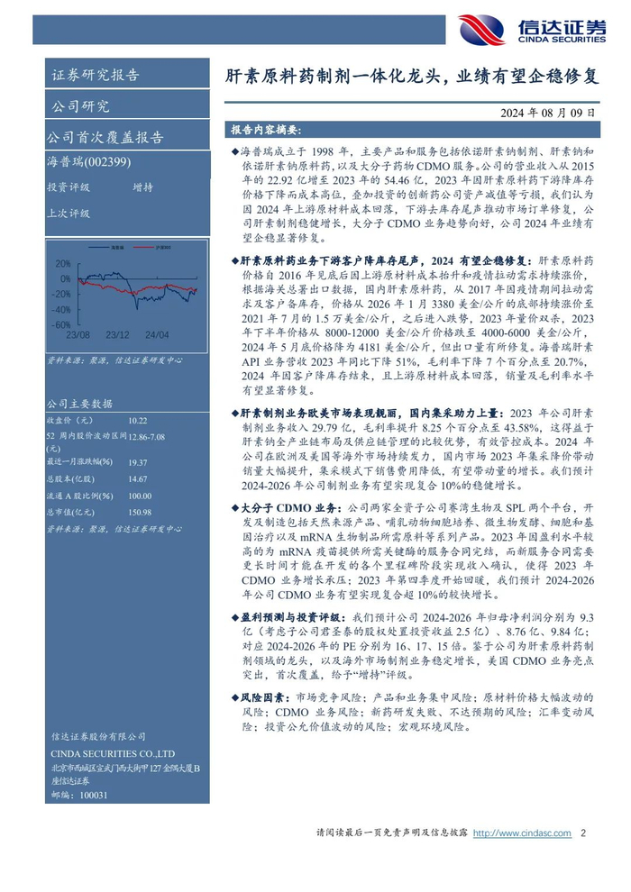 本文来自信达证券研究所2024年8月9日发布的《海普瑞(002399)公司首次覆盖报告:肝素原料药制剂一体化龙头,业绩有望企稳修复》,欲了解具体内容,请阅读报告原文,唐爱金S1500523080002