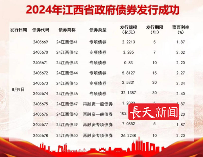 今视频客户端讯 8月9日下午,今年江西第八批政府债券成功发行,本次发行规模185.2283亿元,其中新增专项债券46.8208亿元。