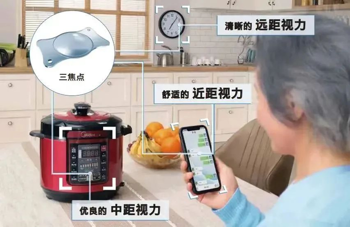 能同时解决老花眼、散光、近视或远视等多种视力问题。采用先进科技,把人眼看远、中、近的三个焦点都设计在一个晶体里,在保证看近和看远用眼需求情况下,优化了中距离视力效果,真正做到了远、中、近视力之间平顺自由转换,全程清晰。
