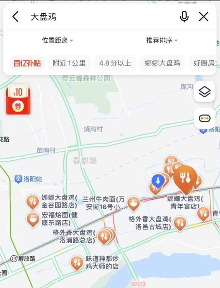 在百度地图查询关键词“大盘鸡”,仅郑州市就有1903家,洛阳市有830家,周口市645家,还有南阳、许昌、驻马店、新乡等河南重要城市也均有三百家以上的门店分布。