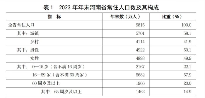 据河南省人民政府发布的《人口概况》显示,截至2023年年末,河南全省常住人口共9815万人,仅次于广东、山东,位列全国第三。