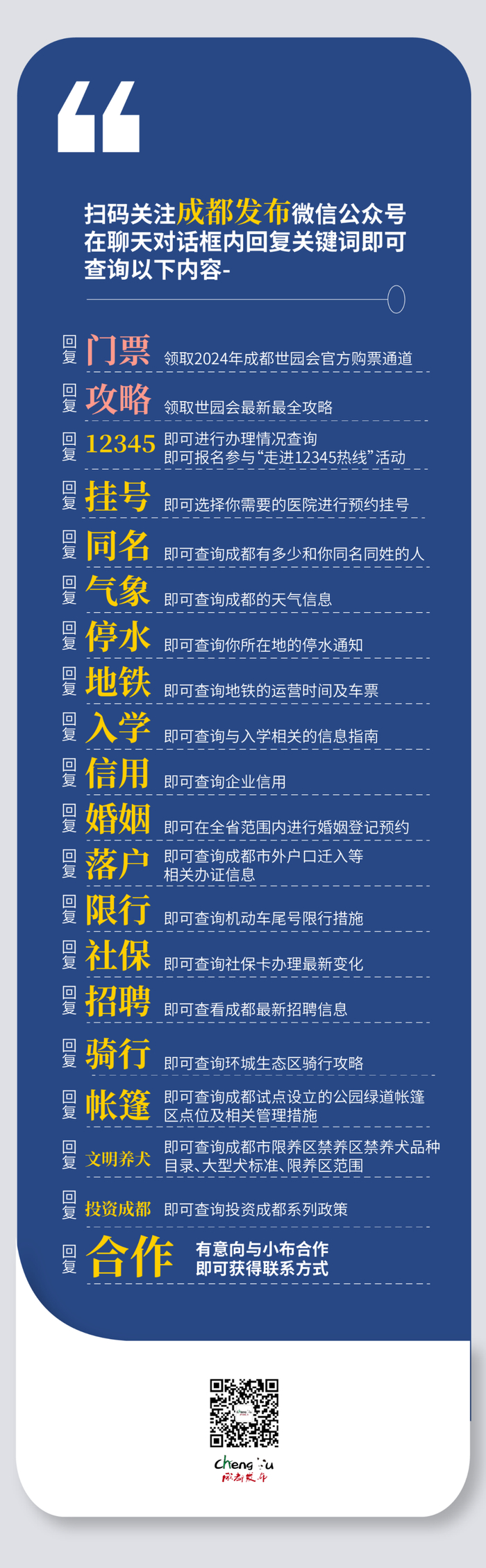 摆不完的龙门阵,说不尽的锦官城。成都,总有一个瞬间,带给你深刻真实的激动、治愈或鼓励;总有一个故事,蛰伏着对生活的领悟与共鸣;总有一个画面,流淌着生命的温柔和坚定。执笔记下,瞬间也便成了永恒。我们想看见,在你的第一人称视角里,对成都的所知所见所思。成都发布“龙门阵里摆成都”栏目期待更多“笔杆子”加入,和我们一起书写在成都的日子,用你的笔触与这座城市同频共振。一经采用,稿酬从优。