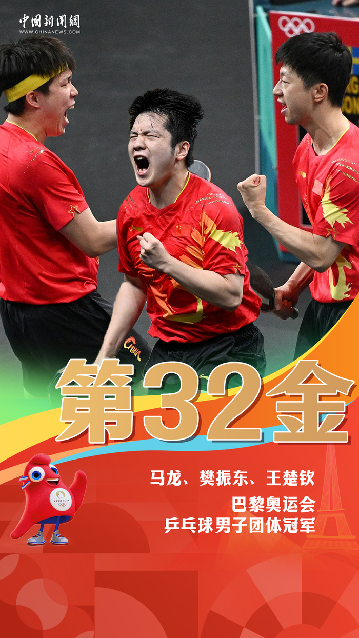 当地时间8月9日,在巴黎奥运会乒乓球男子团体决赛中,由马龙、樊振东、王楚钦、梁靖崑(P卡:替补队员)组成的中国队战胜瑞典队,实现五连冠。这是中国体育代表团在巴黎奥运会上获得的第32金。