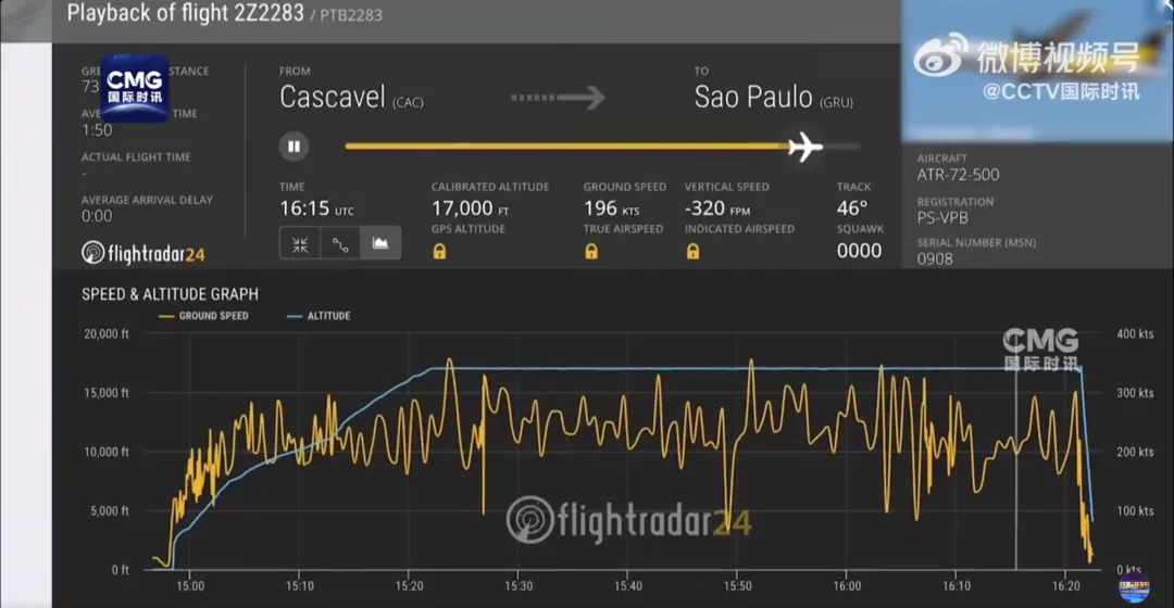 从飞行航班信息平台Flightradar24的数据来看,在当地时间下午1点21分之前,这架客机还保持在17000英尺(约合5182米)的高空飞行。从下午1点21分开始,客机飞行高度持续下降。与此同时,客机的垂直速度骤增且持续变化,最高可达每分钟24064英尺(约合每秒122.25米)。下午1点28分,圣保罗州消防部门收到第一个报警信息。下午3点半左右,巴西官方确认机上人员全部遇难。下午4点左右,确认坠机现场住宅区无伤亡。