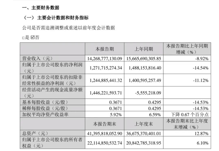 2024年一季度,双汇实现营业收入142.69亿元,同比减少8.92%;归母净利润为12.72亿元,同比减少14.54%;扣非后净利润为12.45亿元,同比减少11.12%;基本每股收益0.3671元,同比减少14.53%。