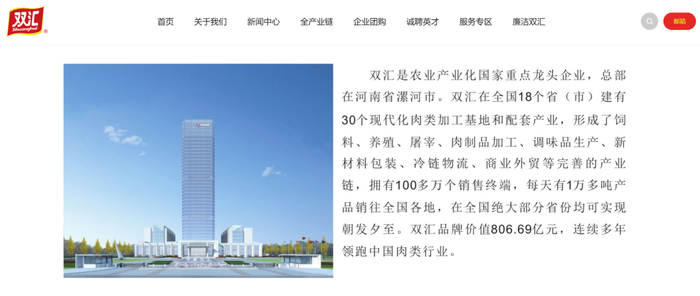据其官网介绍,双汇是农业产业化国家重点龙头企业,目前已形成饲料、养殖、屠宰、肉制品加工、调味品生产、新材料包装、冷链物流、商业外贸等完善的产业链。在全国18个省(市)建有30个现代化肉类加工基地和配套产业,有100多万个销售终端。每天有1万多吨产品销往全国。