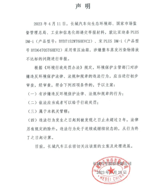 一年多前的2023年5月,长城汽车发布声明,向生态环境部、国家市场监督管理总局、工业和信息化部递交举报材料,就比亚迪秦PLUS DM-i、宋PLUS DM-i采用常压油箱,涉嫌整车蒸发污染物排放不达标的问题进行举报。