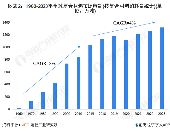 根据全球规模最大的复合材料展会法国复合材料展览会JEC的数据,1960年至今,全球复合材料市场需求呈现持续增长的趋势,复合材料的消耗量从1960年的20万吨上升到了2023年的1320万吨。