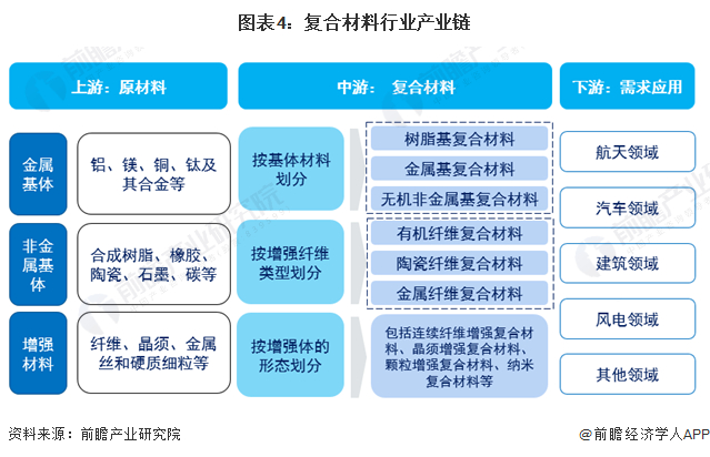 我国复合材料行业产业链上游为基体材料和增强材料,其中基质材料又可以划分为金属基体和非金属基体;中游按照基体材料不同分为树脂基复合材料、金属基复合材料、无机非金属基复合材料等复合材料,按照增强纤维的类型可以划分为有机纤维复合材料、陶瓷纤维复合材料、金属纤维复合材料等复合材料,按照增强体形态则包括连续纤维增强复合材料、晶须增强复合材料、颗粒增强复合材料、纳米复合材料等细分类型;下游领域包括航天领域、汽车领域、建筑领域、风电领域等。