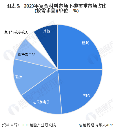 2023年,根据JEC的数据,建筑领域仍为全球复合材料最大的下游需求市场,其需求量占市场总量的25%,其次是物流领域,占比23%。值得注意的是,该两大细分领域的增速已显著放缓,而电气和电子和能源领域则成为了复合材料市场增长的主要推动力。