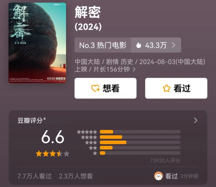 豆瓣评分从6.9分跌至6.6分,也是这部电影割裂观感的直接体现。